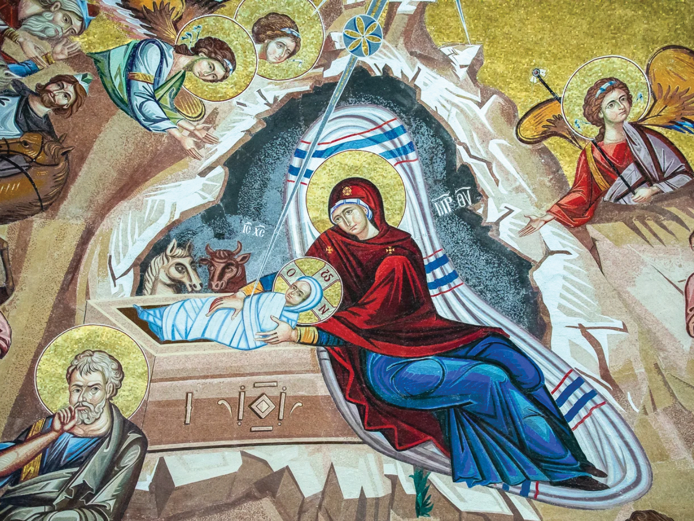 Iată cum ne deslușește taina din icoană: „Ce vom aduce Ție, Hristoase? Că Te‑ai arătat pe pământ ca un om, pentru noi. Fiecare din făpturile cele zidite de Tine mulțumire aduce Ție: îngerii cântarea, cerurile steaua, magii darurile, păstorii minunea, pământul peștera, pustiul ieslea, iar noi pe Maica Fecioara. Dumnezeule, Cel ce ești mai înainte de veci, miluiește‑ne pe noi!“17