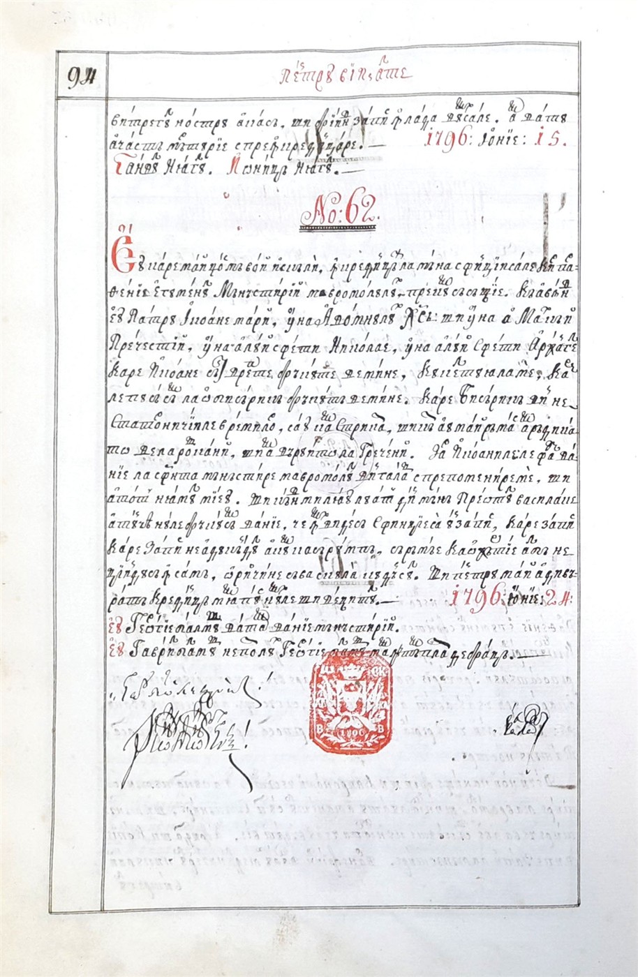 (Arhivele Naționale București, Colecția Manuscrise, ms. nr. 1521, f. 56v, doc. nr. 62 din 1796 iunie 24, copie din 1816)