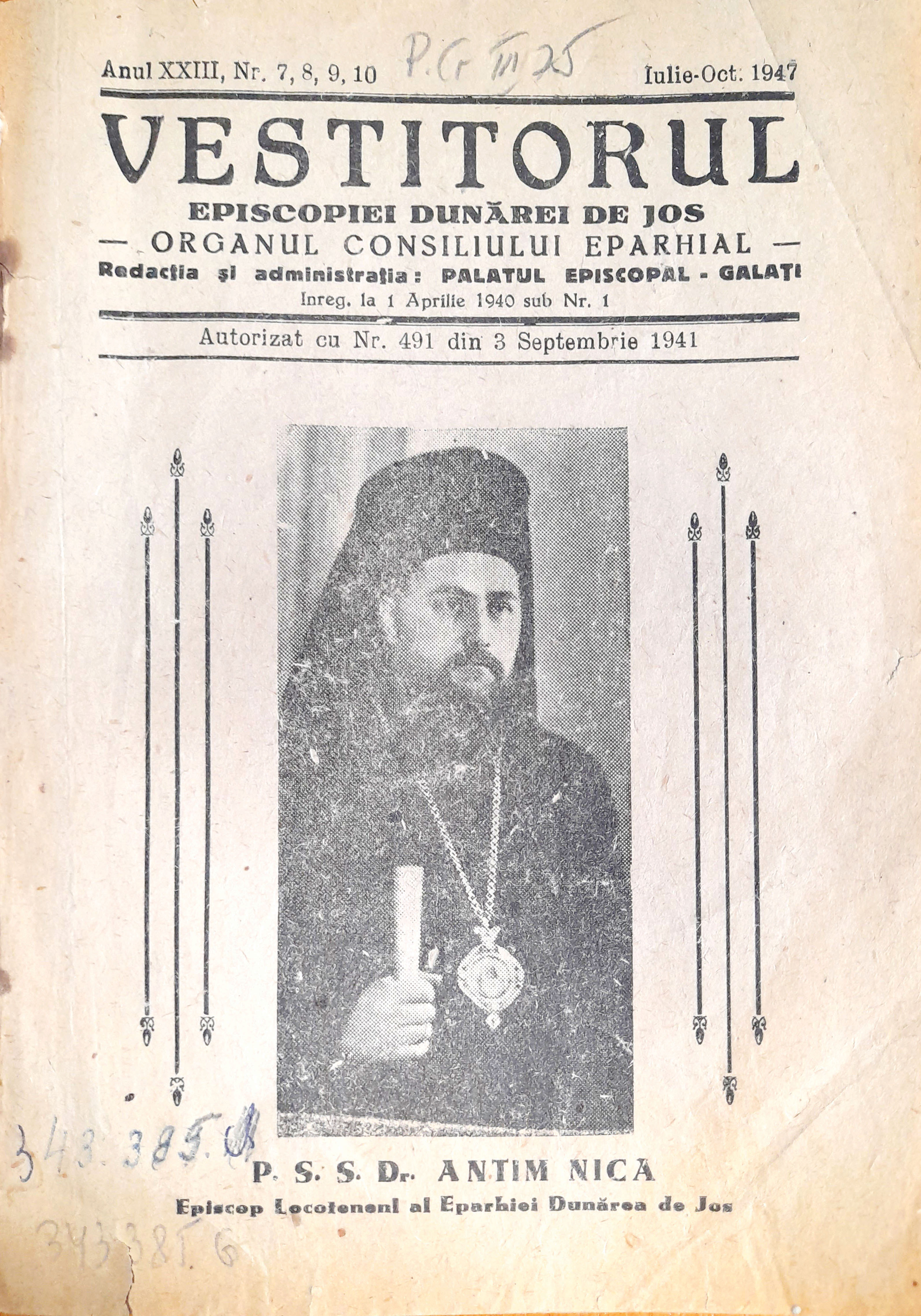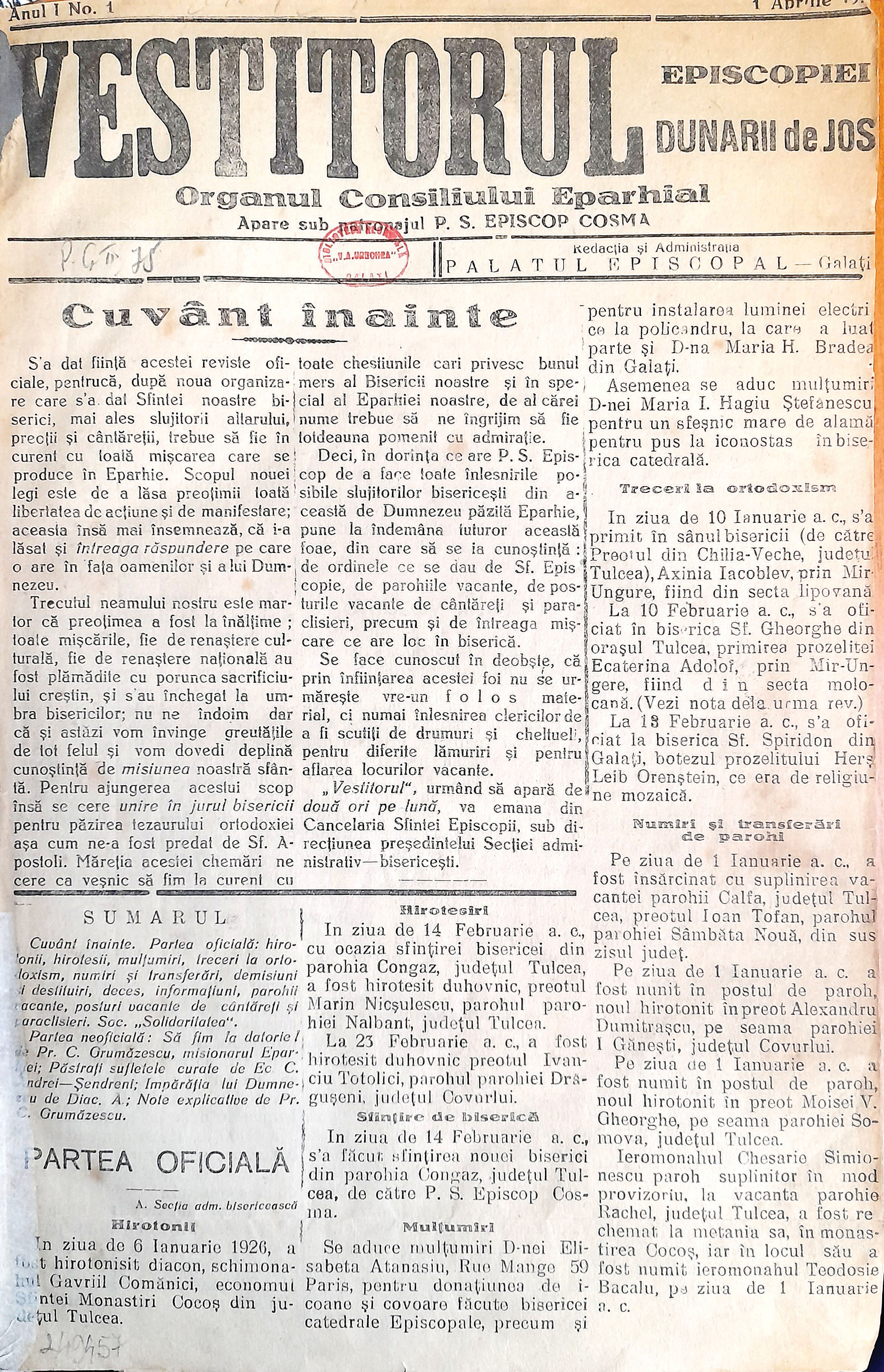 La 1 aprilie 1926 apărea în Galați, din inițiativa Episcopului Cosma Petrovici al Episcopiei Dunării de Jos, cu sprijinul consilierilor eparhiali din cancelaria episcopală, foaia bisericească Vestitorul, organ al Consiliului Eparhial1, cu scopul mărturisit de a informa clericii „de ordinele ce se dau de Sf. Episcopie, de parohiile vacante, de posturile vacante de cântăreți și paraclisieri, precum și de întreaga mișcare ce are loc în Biserică“, toate acestea, întrucât „după noua organizare ce s-a dat Sfintei noastre Biserici2, mai ales slujitorii altarului, preoții și cântăreții trebuie să fie în curent cu toată mișcarea ce se produce în Eparhie“ și deoarece „scopul noii legi este de a lăsa preoțimii toată libertatea de acțiune și de manifestare“, prin aceasta înțelegându-se, desigur, „că i-a lăsat și întreaga răspundere pe care o are în fața oamenilor și a lui Dumnezeu“3. Deși redactorii menționau în primul număr al foii că aceasta urma să apară de două ori pe lună4, nu s-a împlinit o astfel de dorință. Redacția și administrația foii era instalată în Palatul Episcopal de pe str. Domnească, vizavi de Grădina Publică (clădire în care astăzi funcționează Muzeul Arhiepiscopal).